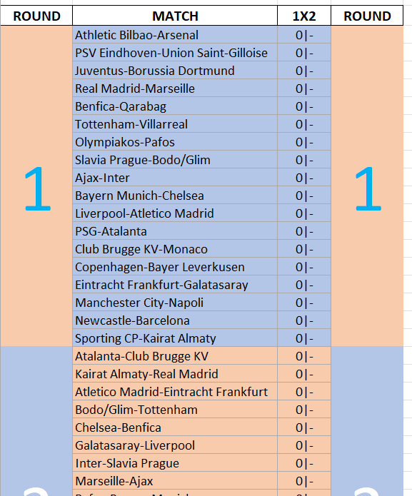 Printable Excel Champions League 2025/2026 Excel Sheet